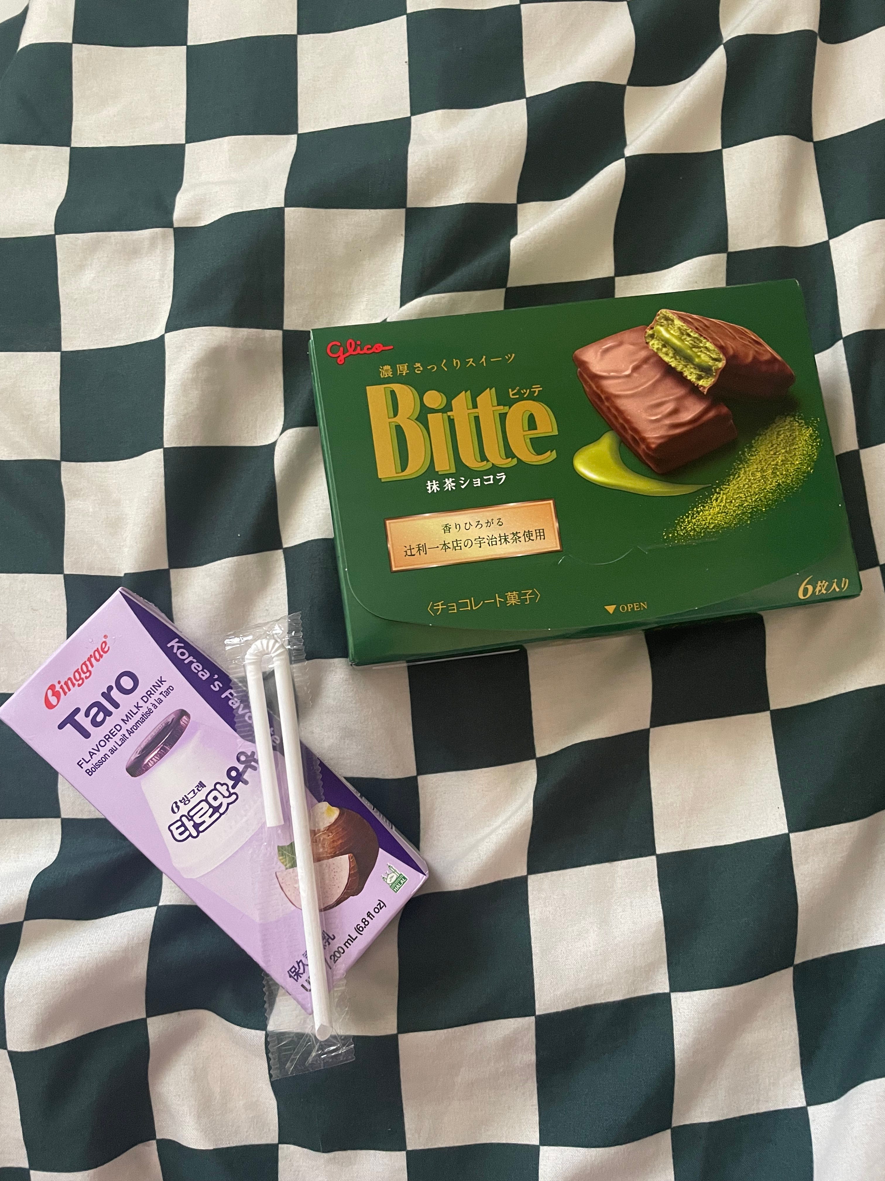 Writing snacks for today’s post, taro milk and some matcha snacks!